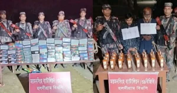 প্রথম বাংলা -ময়মনসিংহ ব্যাটালিয়ন ৩৯ বিজিবি’র আওতাধীন শেরপুর জেলার ঝিনাইগাতী ও নালিতাবাড়ীর হলদীগ্রাম,তাওয়া কুচা, রামচন্দ্রকুড়া ও হাতিপাগাড় বিজিবি এবং ময়মনসিংহের হালুয়াঘাটের বান্দরকাটা বিজিপি’র অভিযানে ভারতীয় মদ, গরু, চিনি, সাবান, সানগ্লাস আটক করা হয়েছে।