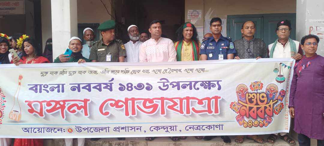 ‘মুছে যাক গ্লানি ঘুছে যাক জরা, অগ্নি স্নানে শুচি হোক ধরা, এসো হে বৈশাখ এসো এসো—‘ শ্লোগানে নেত্রকোণার কেন্দুয়া উপজেলায় বাংলা নববর্ষ ১৪৩১ উপলক্ষ্যে উপজেলা প্রশাসনের উদ্যোগে এক বর্ণাঢ্য মঙ্গল শোভাযাত্রা অনুষ্ঠিত হয়েছে ।
