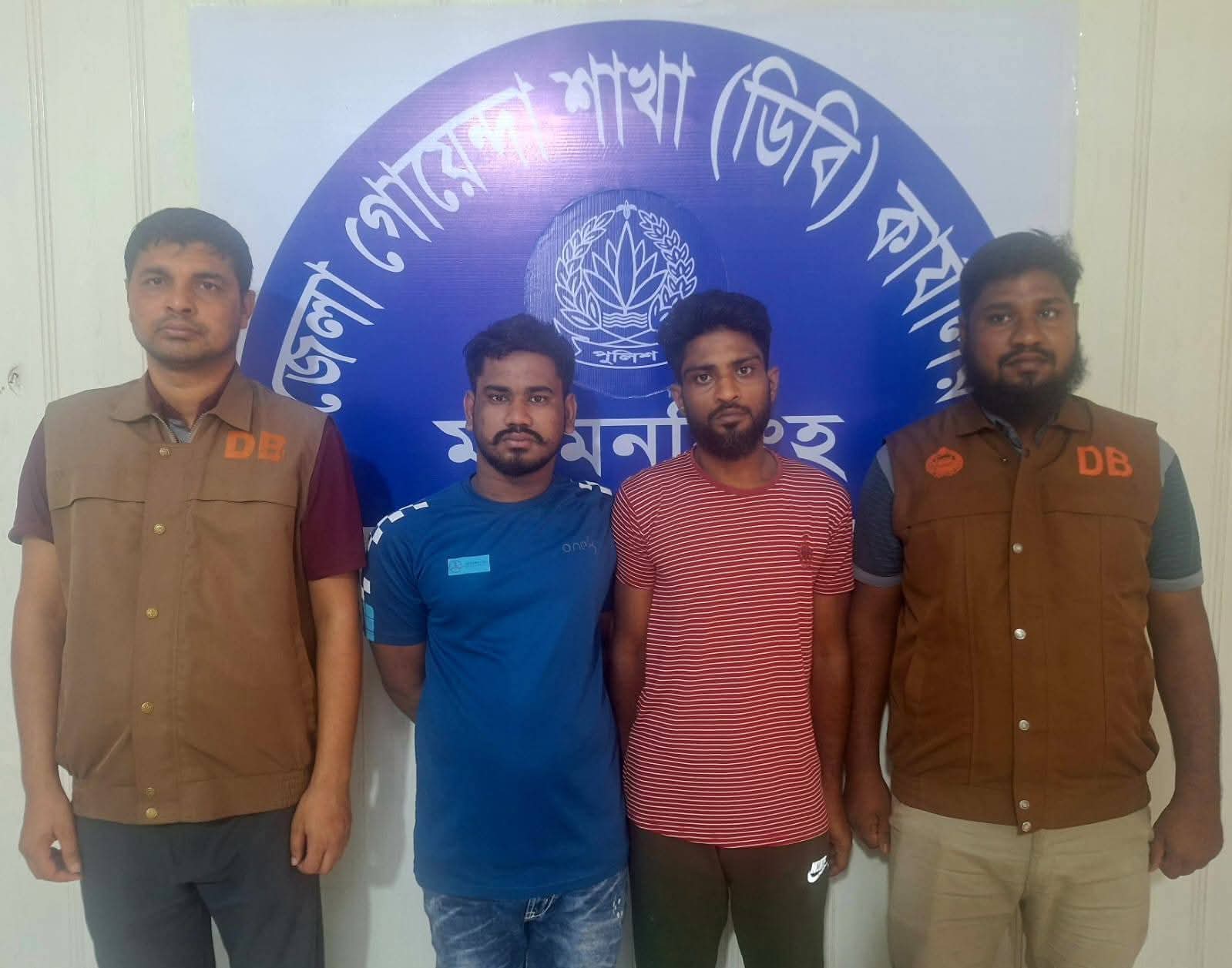 অফিসার ইনচার্জ, জেলা গোয়েন্দা শাখা ডিবি মোঃ মহিদুল ইসলাম সঙ্গীয় অফিসার্স ফোর্স এসআই(নিঃ) রাজীব তালুকদার সংগীয় অফিসার ও ফোর্সসহ অভিযান পরিচালনা করে ময়মন সিংহ জেলার কোতোয়ালী মডেল থানা বাঘমারা ও মাসকান্দা এলাকায় হইতে ২১ জুন ২০২৫ খ্রিঃ তারিখ ভোর ০৪.০০ ঘটিকায় চাঁদা আদায়কারী ১। রাজিব আহাম্মেদ ওরফে বাবু মিয়া (৩০), পিতা-নুরুজ্জামান ওরফে বাদশা মিয়া, মাতা-সুফিয়া জামান, সাং-বাঘমারা, ২। হৃদয় ওরফে সাকিব (২৮), পিতা-মামুন মিয়া ওরফে ঢাকাইয়া মামুন, মাতা-শিল্পি, সাং-কৃষ্টপুর,