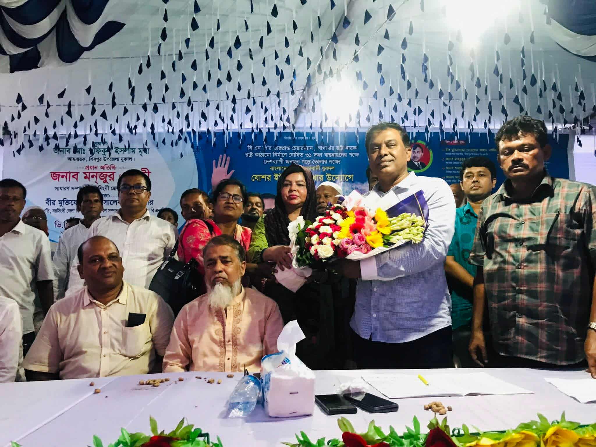 উপজেলা যুবদলের আহবায়ক সফিকুল ইসলাম মৃধার সভাপতি ত্বে প্রধান বক্তা হিসেবে বক্তব্য রাখেন শিবপুর উপজেলা বিএন পির সাধারণ সম্পাদক বীর মুক্তিযোদ্ধা আবু সালেক রিকাবদার ,বিশেষ বক্তা হিসেবে বক্তব্য রাখেন নরসিংদী জেলা বিএনপির সাংগঠনিক সম্পাদক,ও উপজেলা বিএনপির সিনিয়র যুগ্ন সাধা রণ সম্পাদক, ভিপি তোফাজ্জল হোসেন,উপজেলা যুবদলের সদস্য সচিব আপেল মাহমুদ সুমন মুন্সি,অন্যান্যর মধ্যে উপস্থি ত ছিলেন জেলা বিএনপির সহ ধর্ম বিষয়ক সম্পাদক,মাহবুব খান,উপজেলা স্বেচ্ছাসেবক দলের আহবায়ক মাছুম মোল্লা, মৎস্যজীবী দলের সভাপতি,ওমর ফারুক মৃধা টিটু।