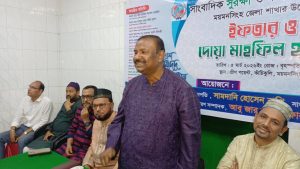 প্রথম বাংলা : সাংবাদিকদের পেশাগত নিরাপত্তা, অধিকার ও কল্যাণ নিশ্চিত করার লক্ষ্যে সাংবাদিক সুরক্ষা ও কল্যা ণ ফাউন্ডেশন ময়মনসিংহ জেলা শাখার উদ্যোগে এক ইফতার ও দোয়া মাহফিল অনুষ্ঠিত হয়েছে।বৃহস্পতিবার ৫ মার্চ ২০২৬ ইং ময়মনসিংহ নগরীর কাঁচিঝুলি এলাকায় অবস্থিত গ্রীণ পয়ে ন্টে আয়োজিত এ অনুষ্ঠানে সাংবাদিক, শিক্ষাবিদ, চিকিৎসক, ব্যবসায়ী ও বিভিন্ন সামাজিক-রাজনৈতিক সংগঠনের নেতৃবৃন্দ অংশগ্রহণ করেন।