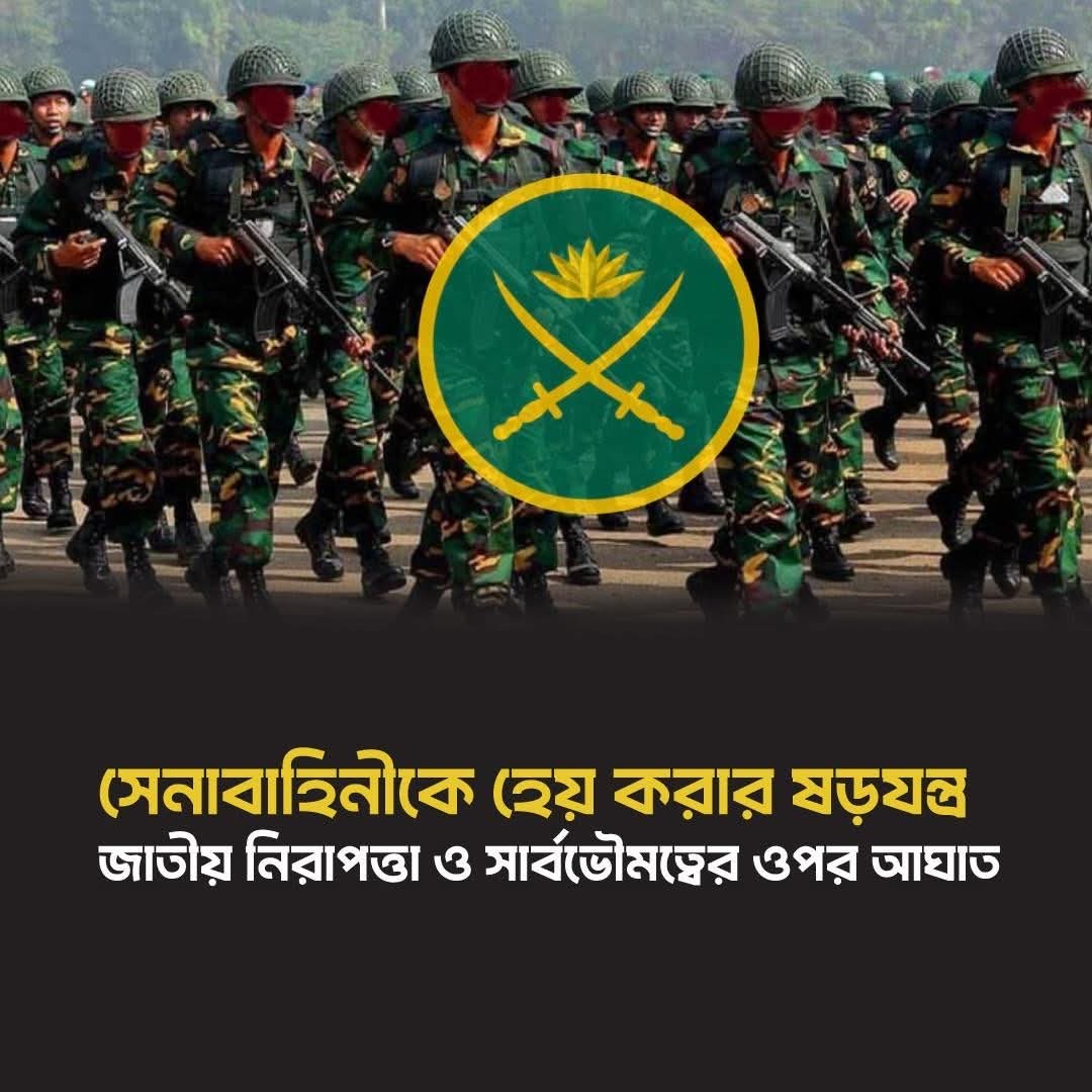 স্বাধীনতার পর থেকে বাংলাদেশের প্রধান রাজনৈতিক নেতারা সেনাবাহিনীকে কখনও অবমাননা করেননি। কারণ তাঁরা জানতেন, সেনাবাহিনী হলো রাষ্ট্রের মূল ভিত্তি। অথচ আজ নিষিদ্ধ ঘোষিত জঙ্গি, মৌলবাদী ও উগ্রবাদী চক্র রাজনৈতিক ছত্রছায়ায় থেকে সেনাপ্রধানকে লক্ষ্য করে কুরুচিপূর্ণ স্লোগান দিচ্ছে। তারা জানেযদি সেনাবাহিনীকে দুর্বল করা যায়, তবে রাষ্ট্র ভেঙে পড়বে, আর সেই ভাঙনের সুযোগে তারা দেশে সন্ত্রাস, জঙ্গিবাদ আর অবৈধ অস্ত্রের রাজত্ব কায়েম করতে পারবে।